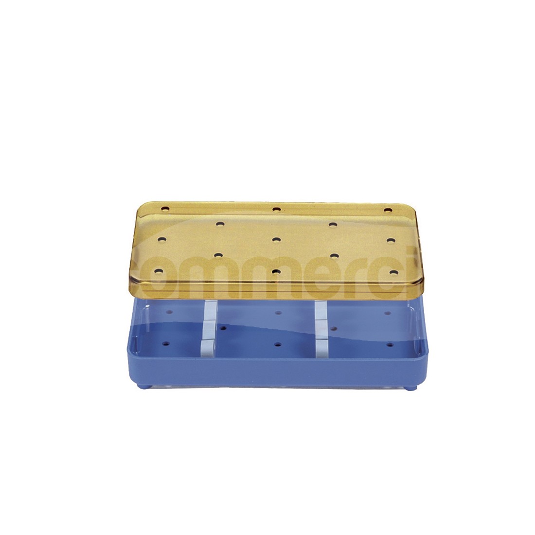 Vassoio con coperchio e guide interne (per max 2 strumenti) realizzato in Radel, lavabile e sterilizzabile. Il contenitore è appositamente concepito per il corretto posizionamento in sicurezza di strumenti taglienti aventi una lunghezza massima di 14 cm. Dotato di superfici traforate può essere utilizzato per il lavaggio, sterilizzazione, stoccaggio e movimentazione.