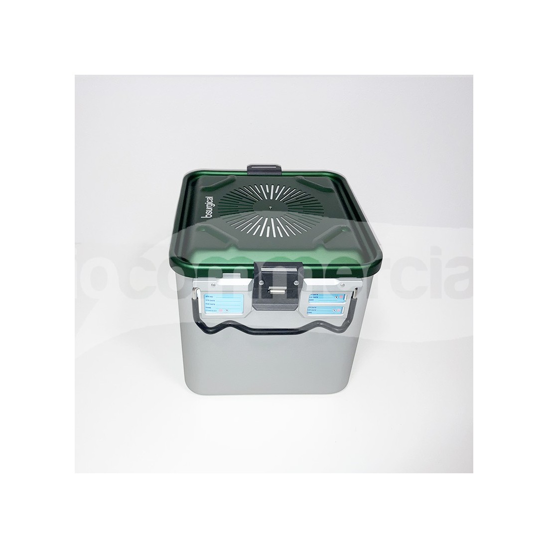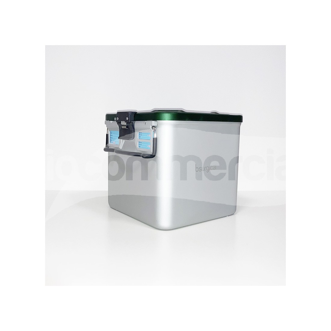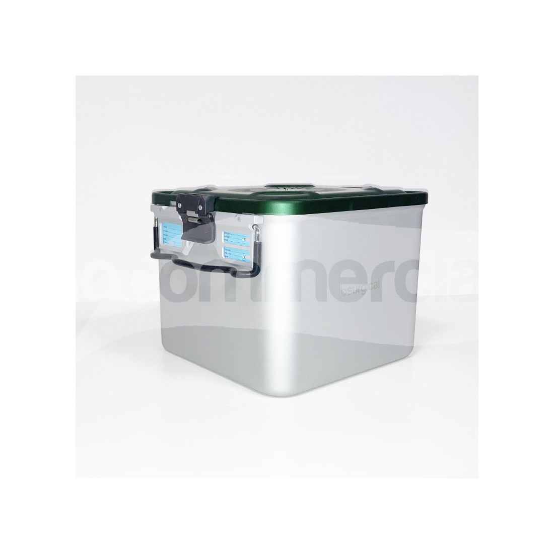 Container in alluminio per sterilizzazione a vapore 1/2 unità, misura 285x280x260mm, con coperchio verde.