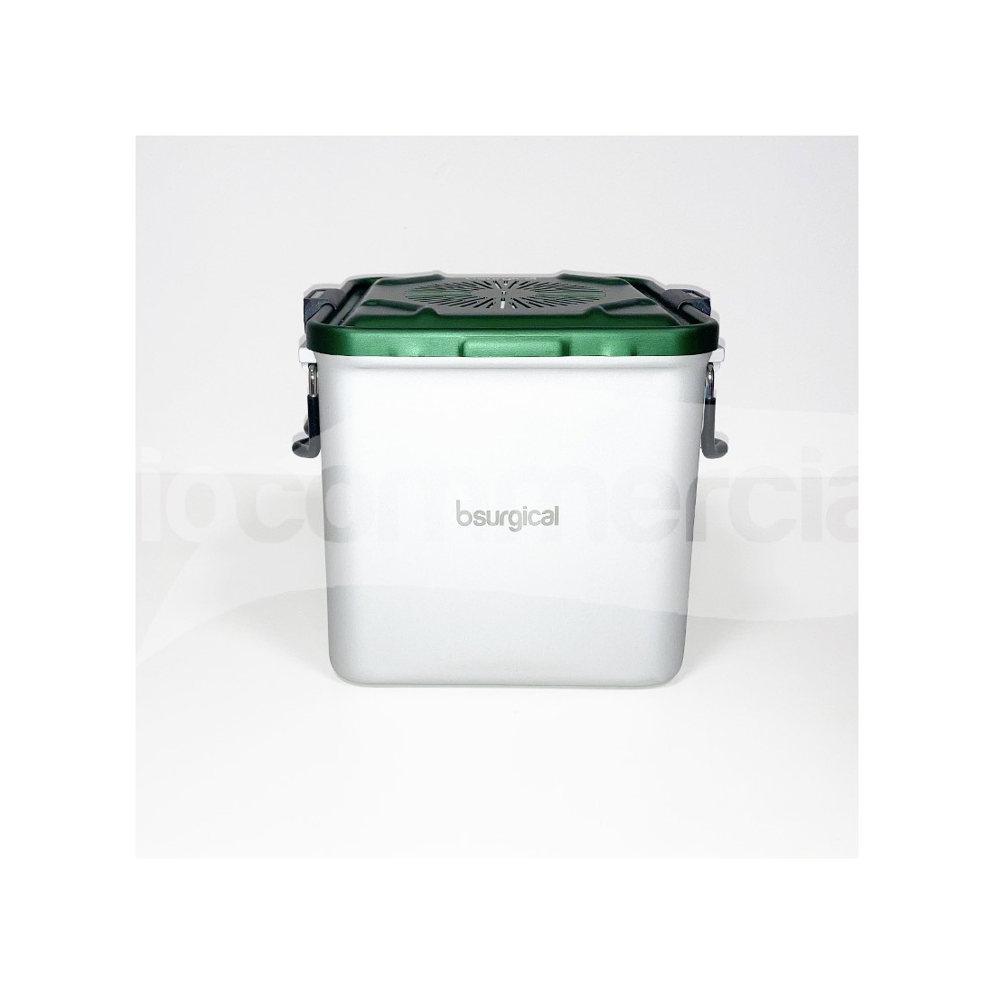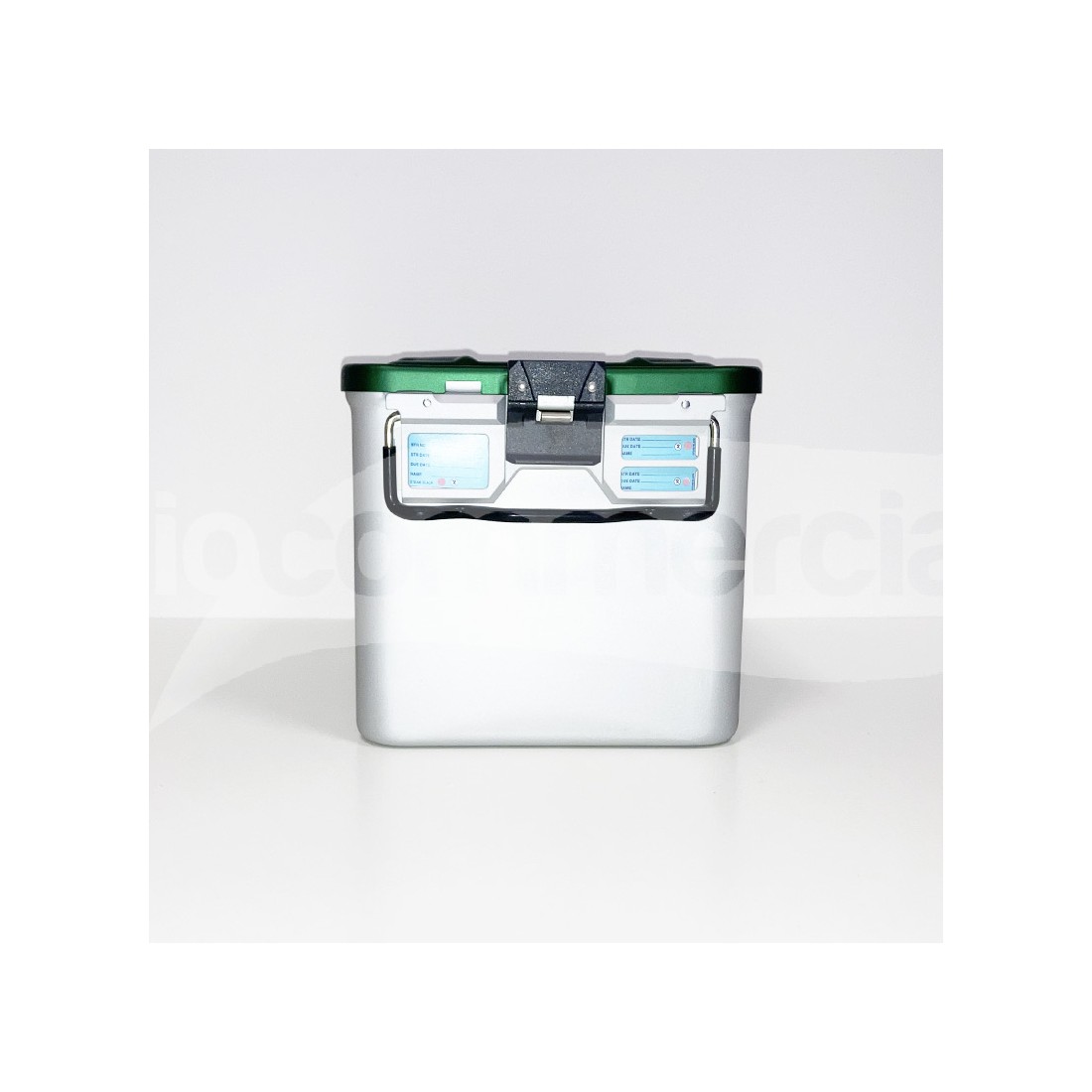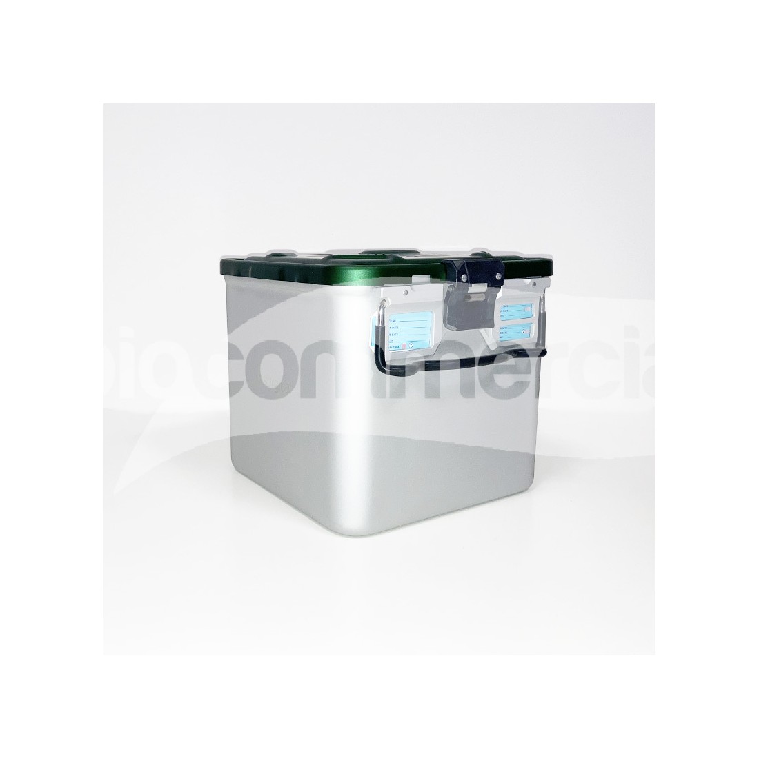 Container in alluminio per sterilizzazione a vapore 1/2 unità, misura 285x280x260mm, con coperchio verde.