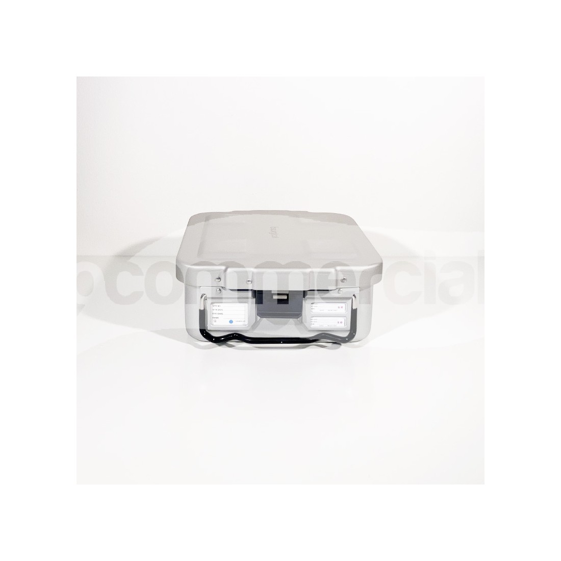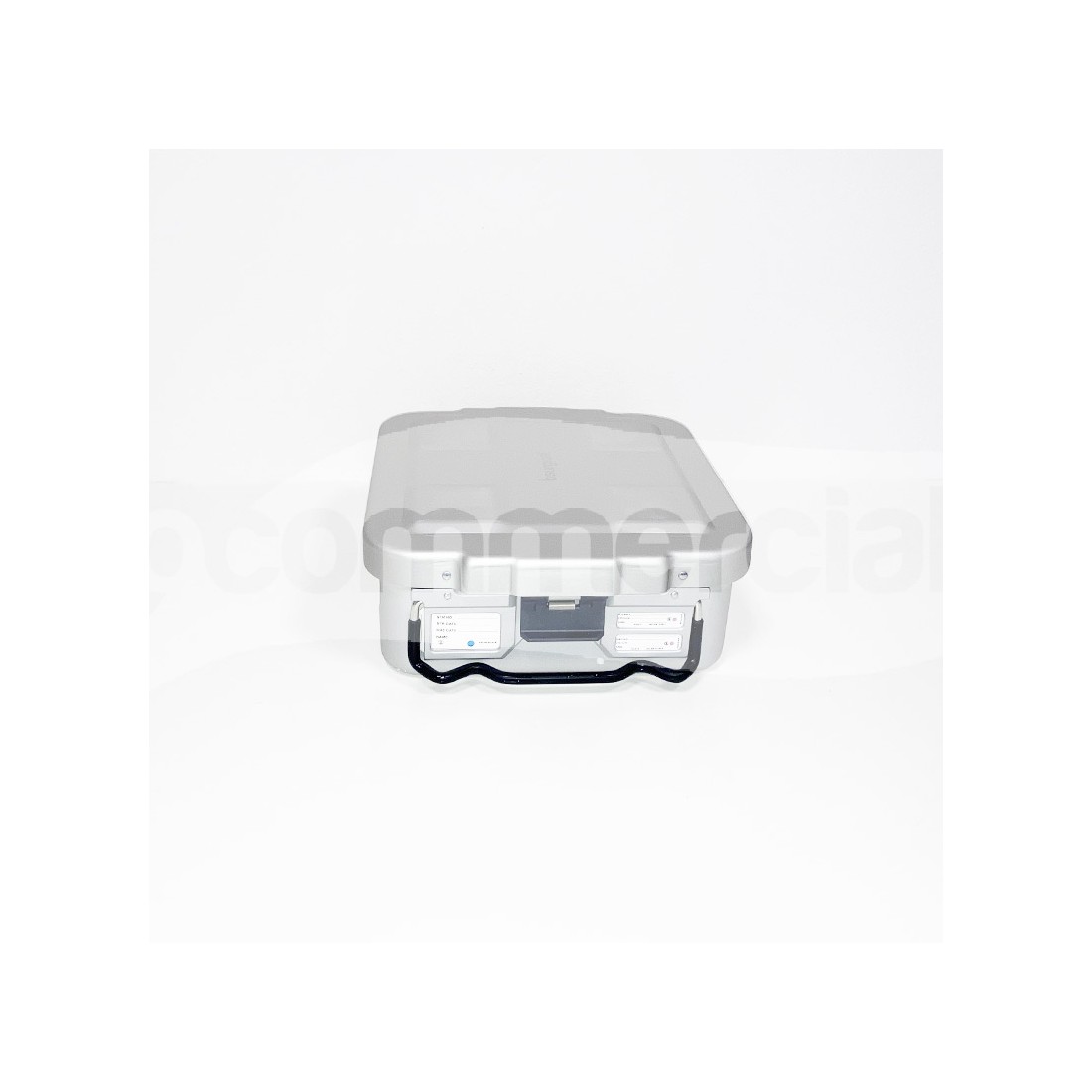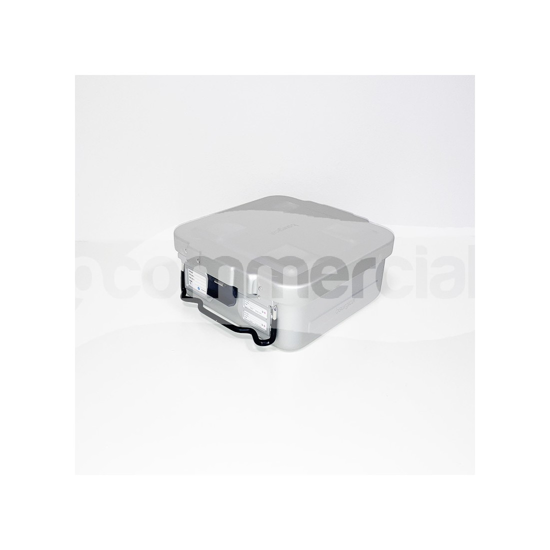 Container 1/2 unità di colore grigio per sterilizzazione strumentario chirurgico, dotato di filtro monouso con possibilità di installare filtro pluriuso in PTFE. Il container è dotato di 2 maniglie basculanti in acciaio inox, rivestite in silicone anti scottatura e di 2 chiusure di sicurezza in lega di colore nero con possibilità di applicazione del sigillo di sicurezza. A completamento del container è previsto un coperchio di sicurezza che protegge il filtro da eventuale polvere in sospensione.