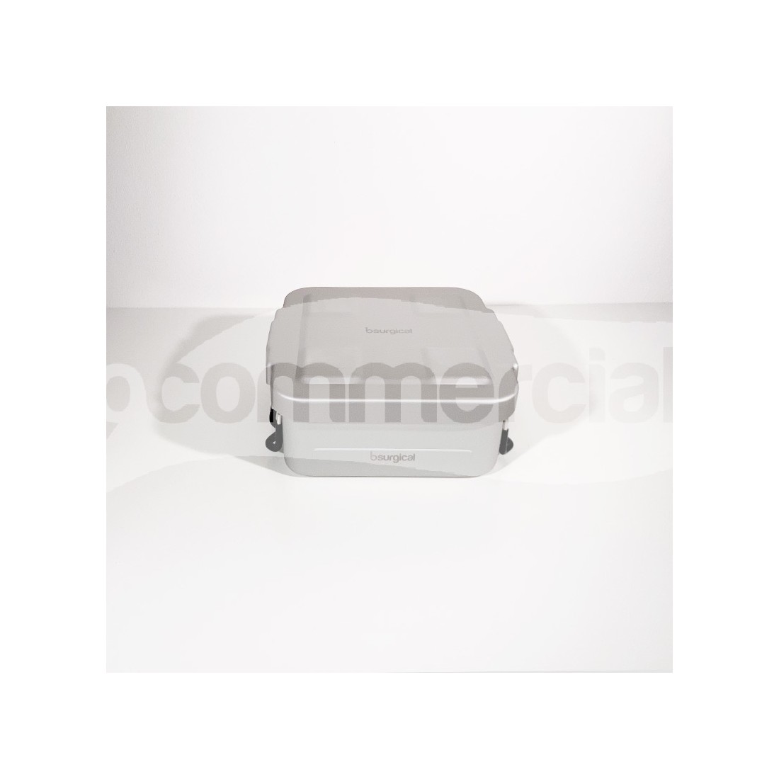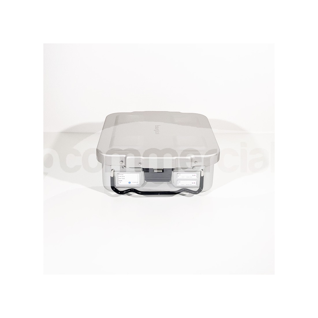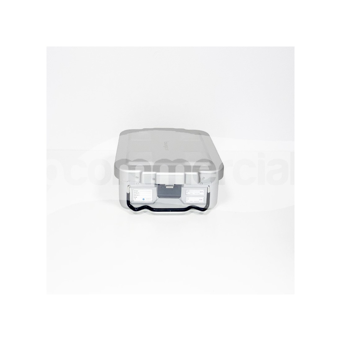 Container 1/2 unità di colore grigio per sterilizzazione strumentario chirurgico, dotato di filtro monouso con possibilità di installare filtro pluriuso in PTFE. Il container è dotato di 2 maniglie basculanti in acciaio inox, rivestite in silicone anti scottatura e di 2 chiusure di sicurezza in lega di colore nero con possibilità di applicazione del sigillo di sicurezza. A completamento del container è previsto un coperchio di sicurezza che protegge il filtro da eventuale polvere in sospensione.