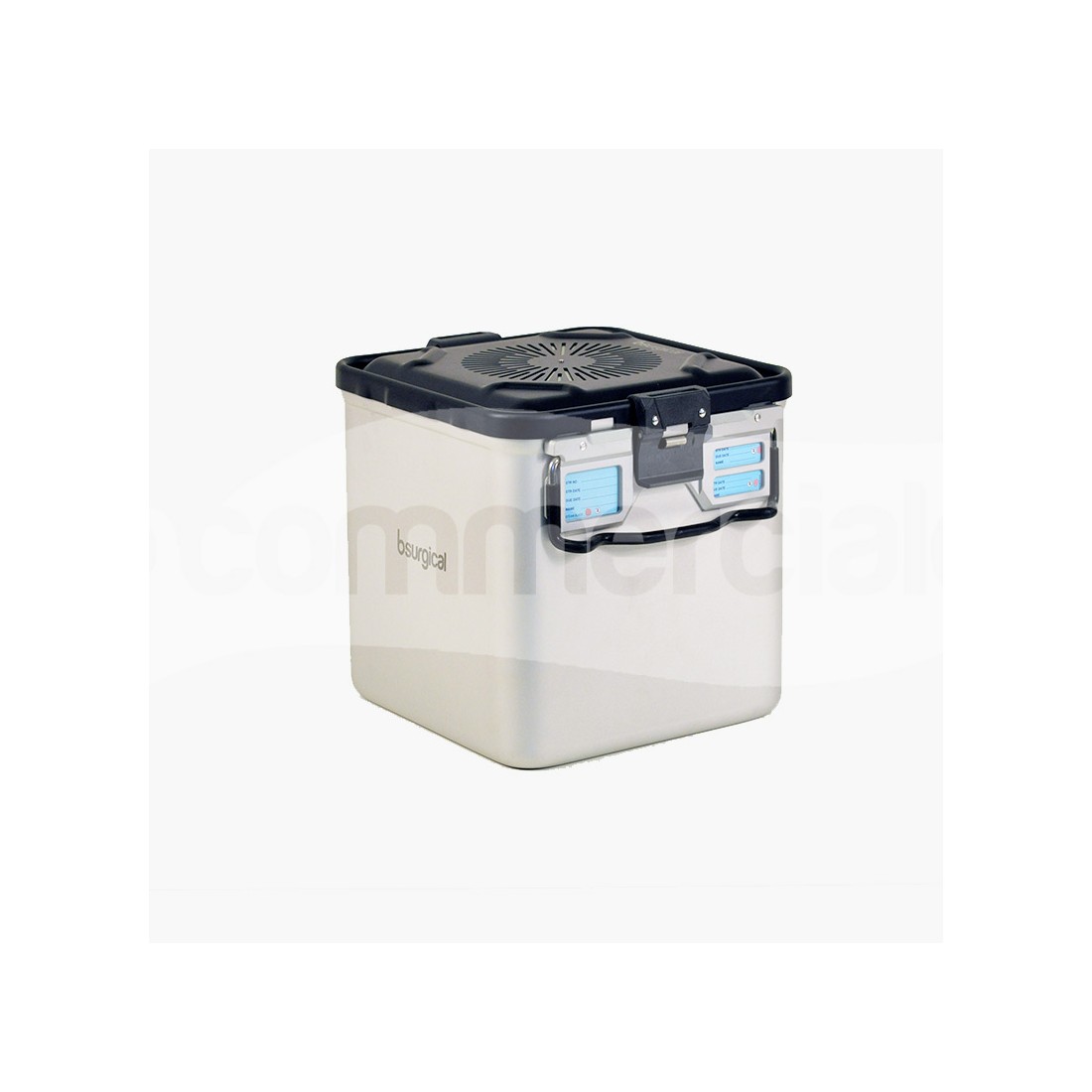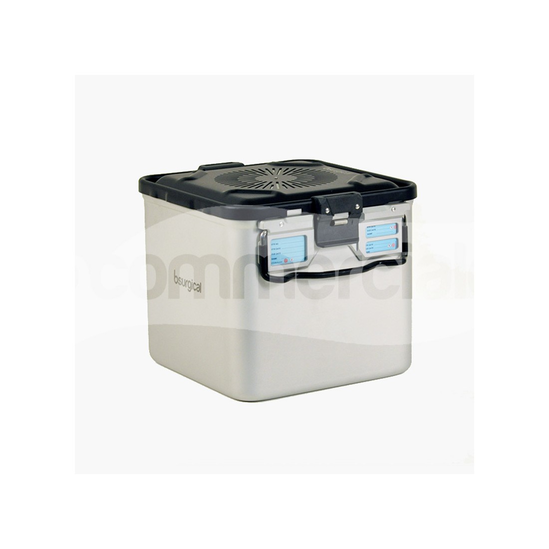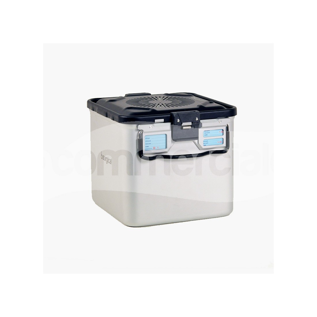 Container per sterilizzazione a vapore con filtro monouso, dotato di coperchio con 2 chiusure di sicurezza. La base è completa di 2 maniglie basculanti in acciaio inox rivestite in silicone anti scottatura e di slot per inserimento targhette posti nella parte frontale del contenitore.
