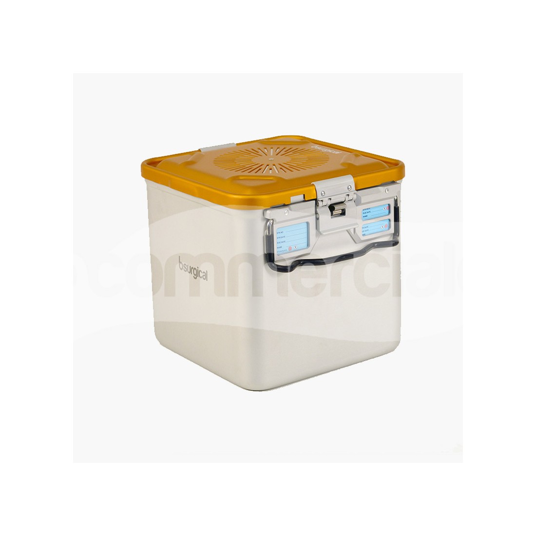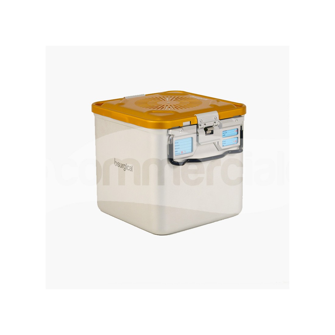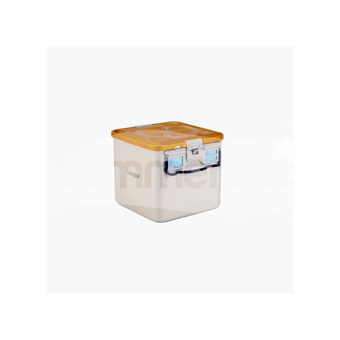 Container in alluminio per sterilizzazione a vapore 1/2 unità, misura 285x280x260mm, con coperchio giallo.