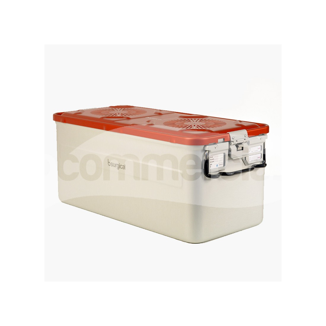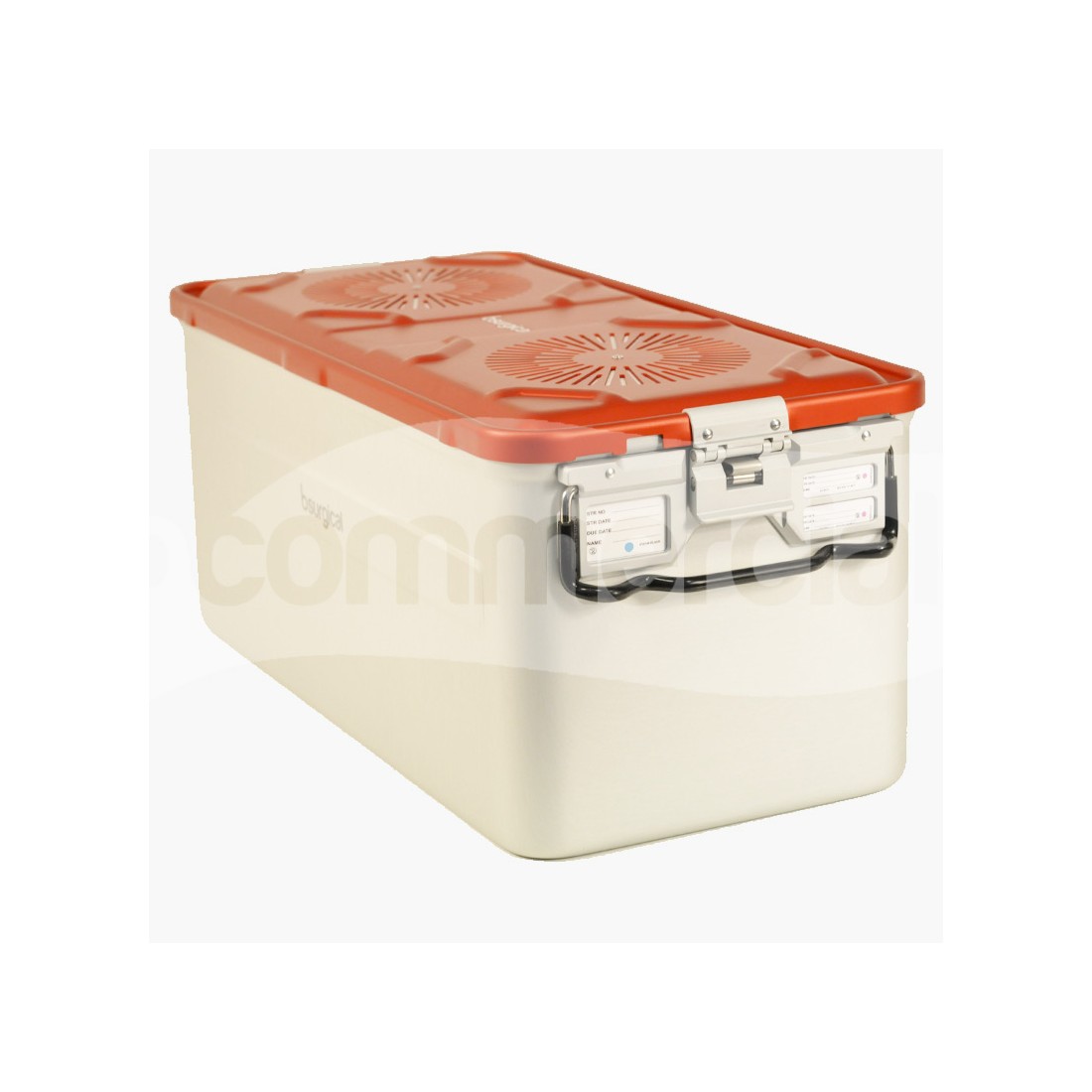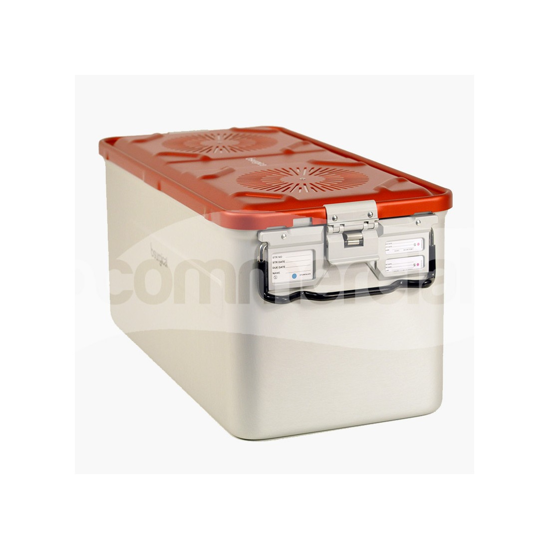 Container ad una unità (1/1) per sterilizzazione a vapore, realizzato in alluminio anodizzato di alta qualità e completo di base e coperchio con n. 2 filtri. Il container è dotato di bordi smussi atraumatici e base provvista di piedini sollevatori. Dotato di n. 2 maniglie basculanti poste nei lati corti del container e rivestite in silicone anti scottatura. Il coperchio del container è dotato di n. 2 chiusure di sicurezza e di slot porta targhette per una corretta identificazione e tracciabilità del contenuto.