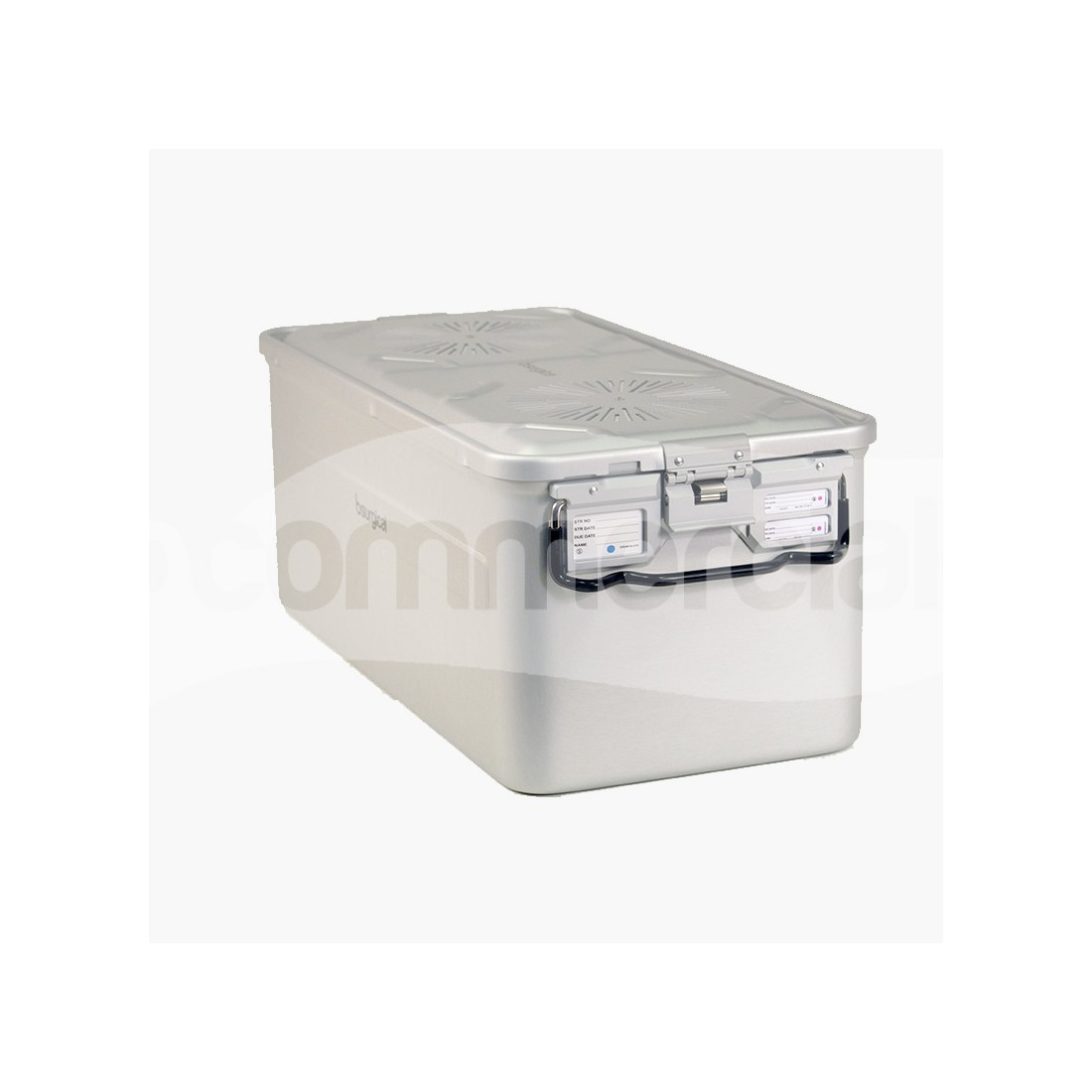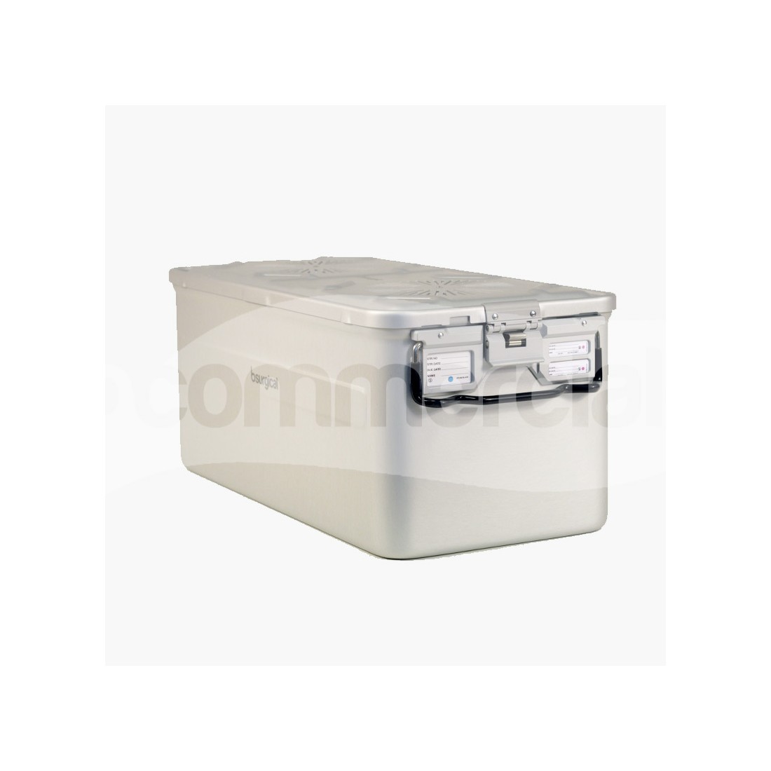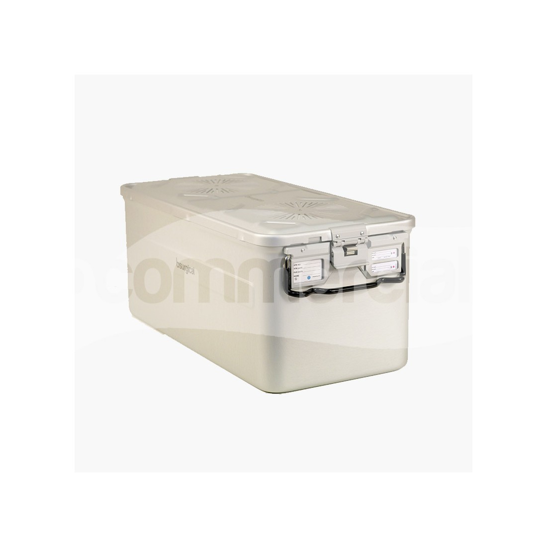 Container ad una unità (1/1) per sterilizzazione a vapore, realizzato in alluminio anodizzato di alta qualità e completo di base e coperchio con n. 2 filtri. Il container è dotato di bordi smussi atraumatici e base provvista di piedini sollevatori. Dotato di n. 2 maniglie basculanti poste nei lati corti del container e rivestite in silicone anti scottatura. Il coperchio del container è dotato di n. 2 chiusure di sicurezza e di slot porta targhette per una corretta identificazione e tracciabilità del contenuto.