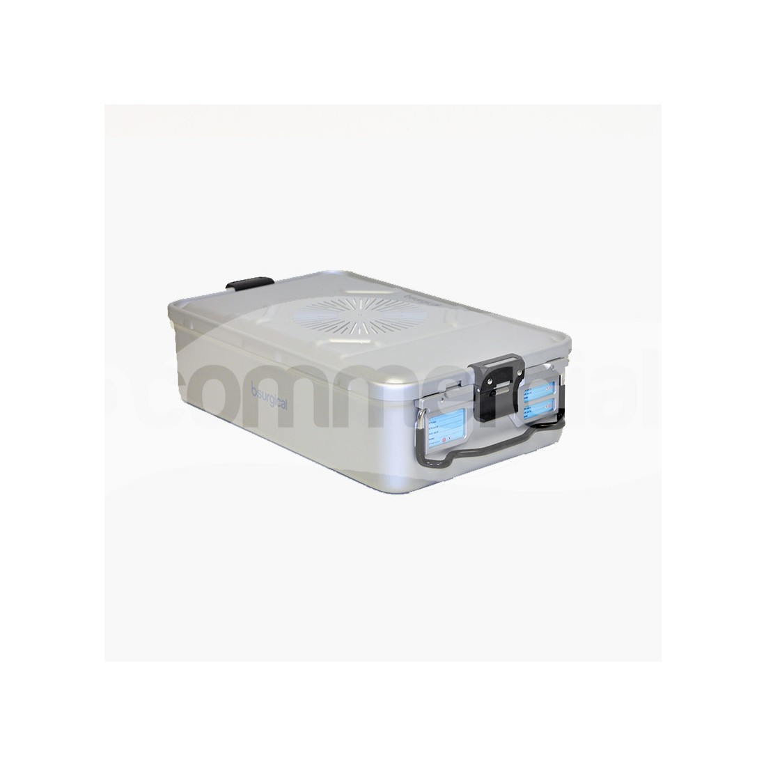 Contenitore per sterilizzazione a vapore a marchio bsurgical, realizzato in alluminio anodizzato, completo di base e coperchio con filtro. Il container è dotato di n. 2 maniglie basculanti poste sui lati del contenitore e rivestite in silicone di colore nero per prevenire eventuali scottature. Il coperchio è dotato di n. 2 chiusure di sicurezza a cui è possibile applicare sigilli anti efrazione monouso. Dotato di porta targhette sui lati frontali per una corretta identificazione e tracciabilità.