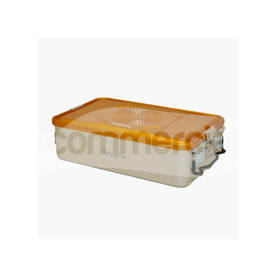Contenitore per sterilizzazione a vapore a marchio bsurgical, realizzato in alluminio anodizzato, completo di base e coperchio con filtro. Il container è dotato di n. 2 maniglie basculanti poste sui lati del contenitore e rivestite in silicone di colore nero per prevenire eventuali scottature. Il coperchio è dotato di n. 2 chiusure di sicurezza a cui è possibile applicare sigilli anti efrazione monouso. Dotato di porta targhette sui lati frontali per una corretta identificazione e tracciabilità.