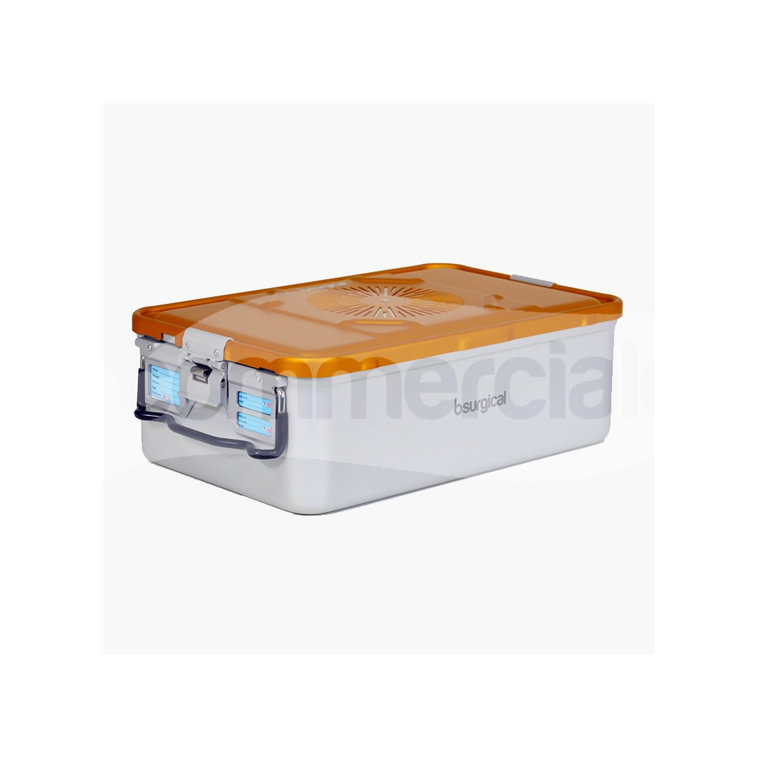 Contenitore per sterilizzazione a vapore a marchio bsurgical, realizzato in alluminio anodizzato, completo di base e coperchio con filtro. Il container è dotato di n. 2 maniglie basculanti poste sui lati del contenitore e rivestite in silicone di colore nero per prevenire eventuali scottature. Il coperchio è dotato di n. 2 chiusure di sicurezza a cui è possibile applicare sigilli anti efrazione monouso. Dotato di porta targhette sui lati frontali per una corretta identificazione e tracciabilità.