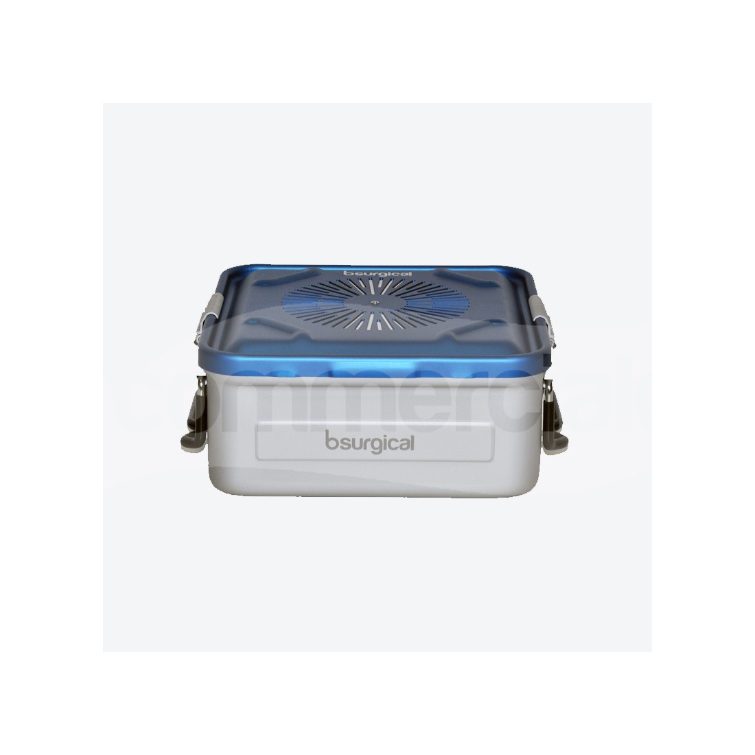 Container 1/2 unità di colore grigio per sterilizzazione strumentario chirurgico, dotato di filtro monouso con possibilità di installare filtro pluriuso in PTFE di colore verde. Il container è dotato di 2 maniglie basculanti in acciaio inox, rivestite in silicone anti scottatura e di 2 chiusure di sicurezza in lega di colore nero con possibilità di applicazione del sigillo di sicurezza.