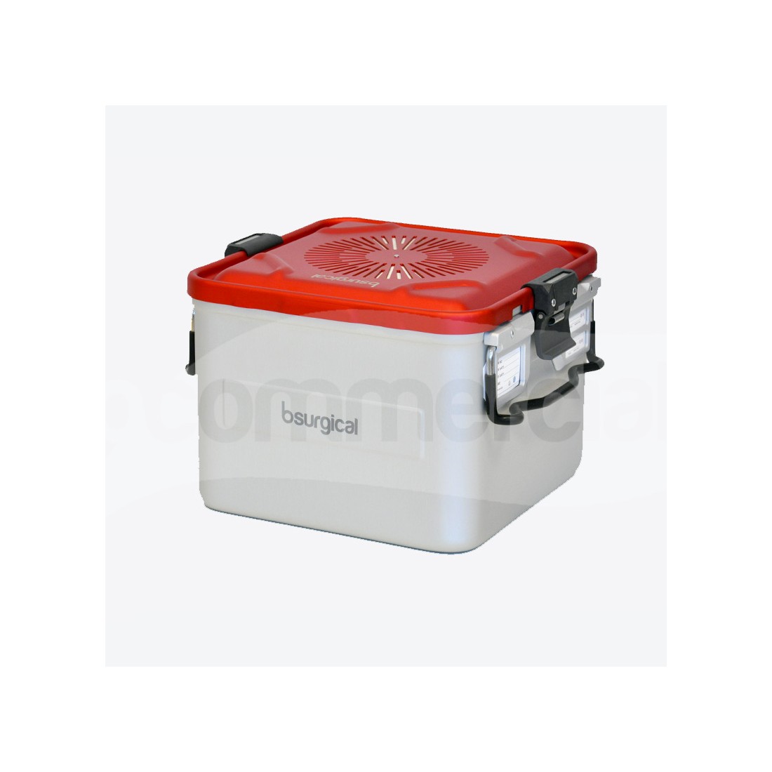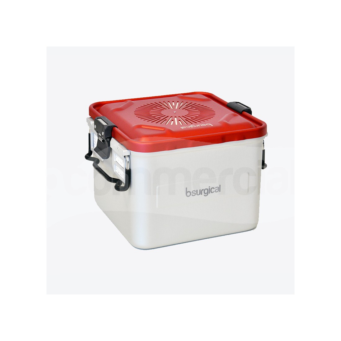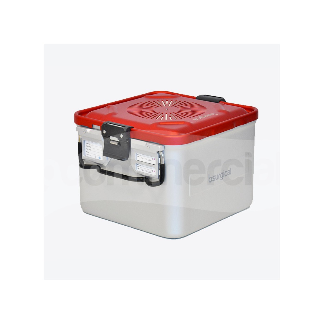 Container in alluminio per sterilizzazione a vapore 1/2 unità, misura 285x280x200mm, con coperchio di colore rosso.