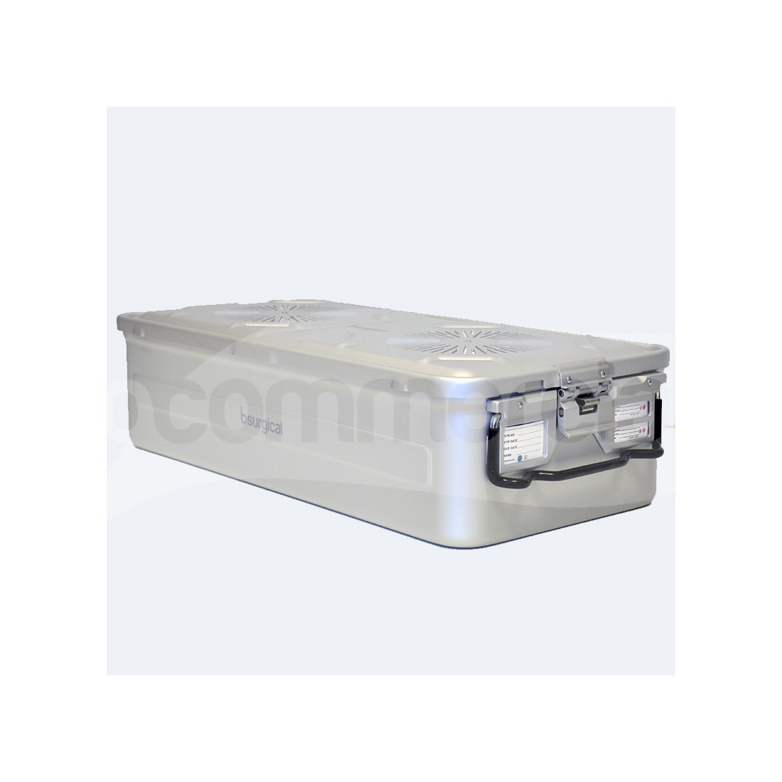 Container ad una unità (1/1) per sterilizzazione a vapore, realizzato in alluminio anodizzato di alta qualità e completo di base e coperchio con n. 2 filtri. Il container è dotato di bordi smussi atraumatici e base provvista di piedini sollevatori. Dotato di n. 2 maniglie basculanti poste nei lati corti del container e rivestite in silicone anti scottatura. Il coperchio del container è dotato di n. 2 chiusure di sicurezza e di slot porta targhette per una corretta identificazione e tracciabilità del contenuto.