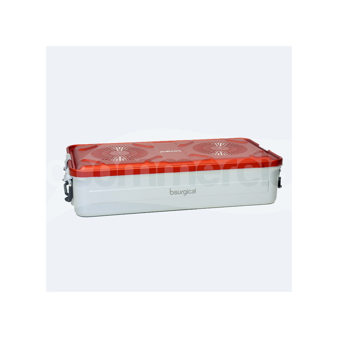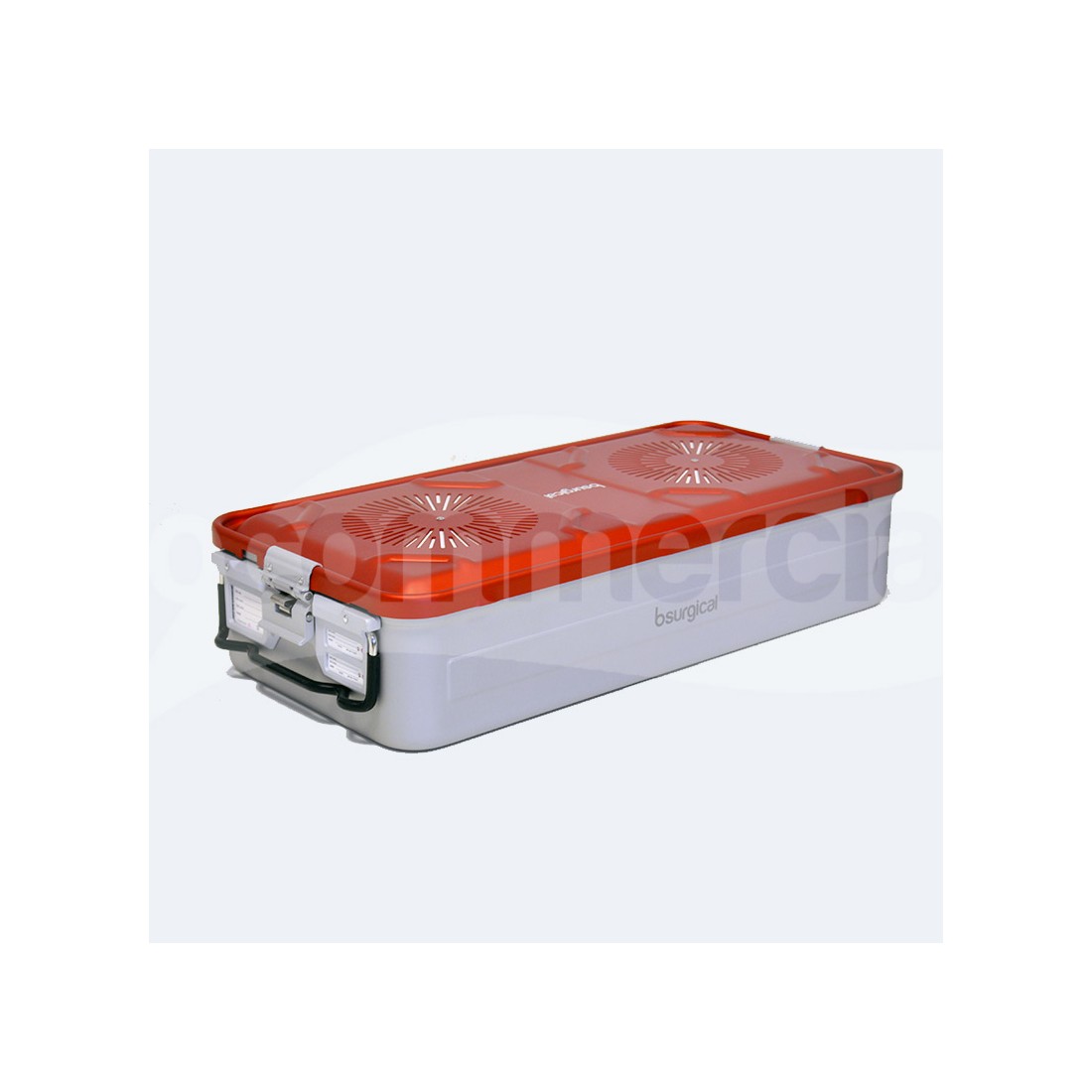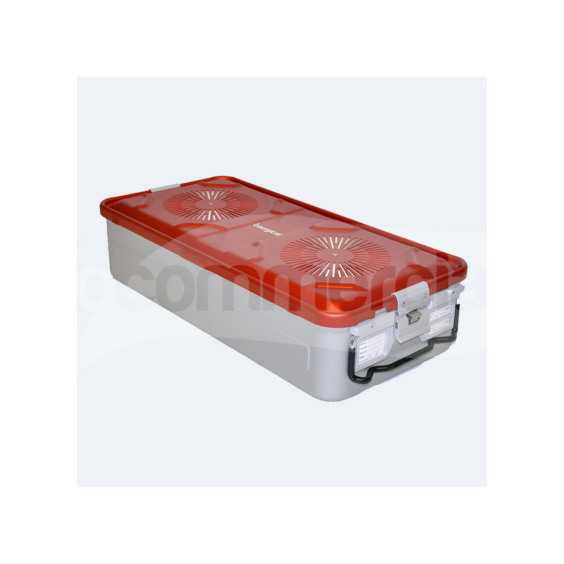 Container ad una unità (1/1) per sterilizzazione a vapore, realizzato in alluminio anodizzato di alta qualità e completo di base e coperchio con n. 2 filtri. Il container è dotato di bordi smussi atraumatici e base provvista di piedini sollevatori. Dotato di n. 2 maniglie basculanti poste nei lati corti del container e rivestite in silicone anti scottatura. Il coperchio del container è dotato di n. 2 chiusure di sicurezza e di slot porta targhette per una corretta identificazione e tracciabilità del contenuto.