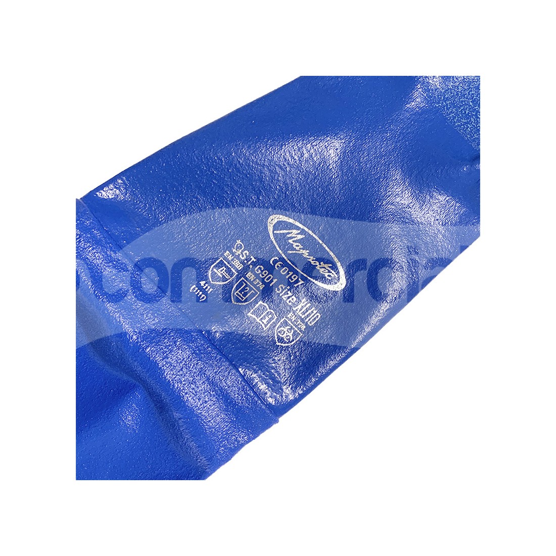 Guanto protettivo extra lungo per una completa protezione del braccio dell'operatore sanitario durante le fasi di lavaggio manuale. Il guanto è composto interamente da nitrile ad alto spessore con fodera interna in cotone.