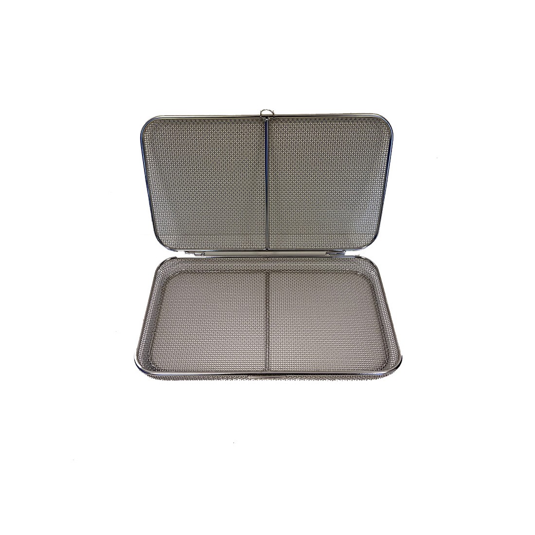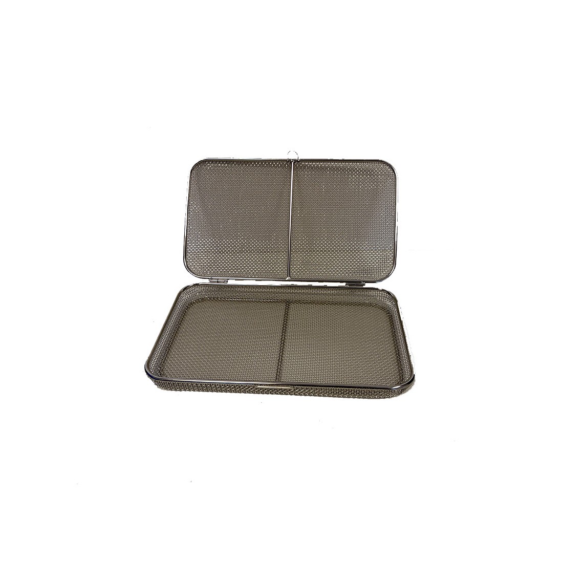 Contenitore realizzato in filo di acciaio inox con trama standard, con bordo ribattuto, ideale per il lavaggio, l'organizzazione e la sterilizzazione di strumentario chirurgico di piccole e medie dimensioni come frese, valvole, connettori, etc.