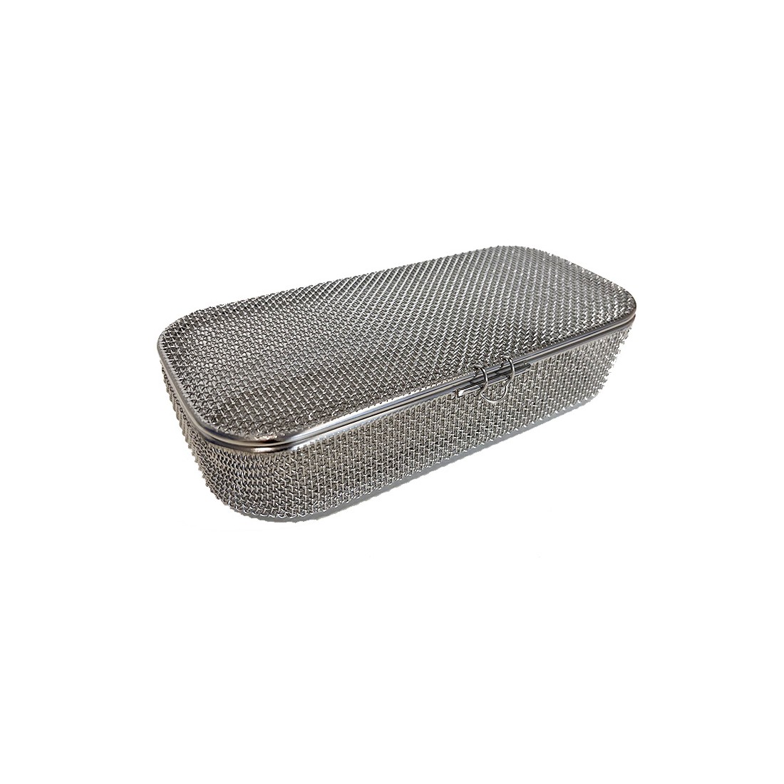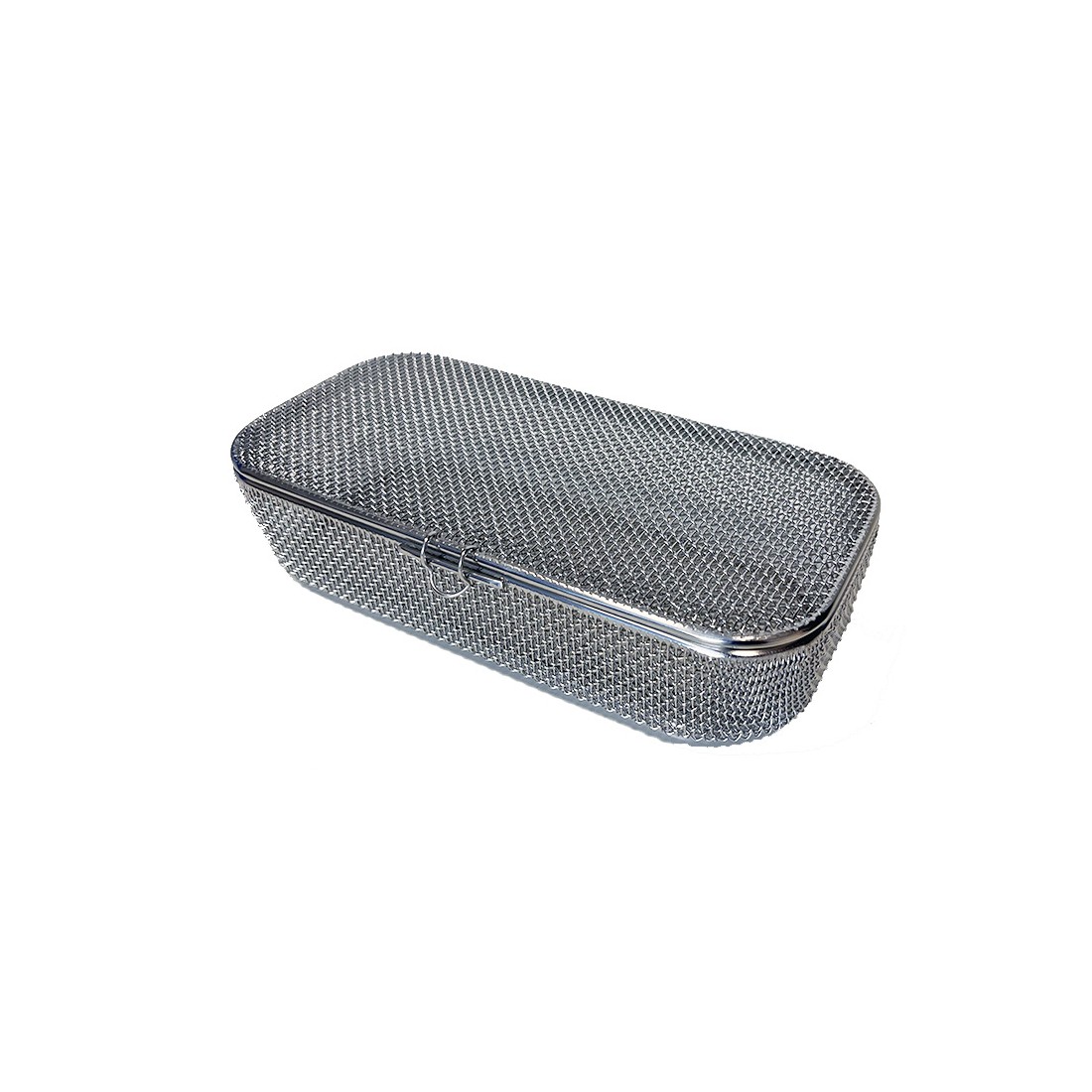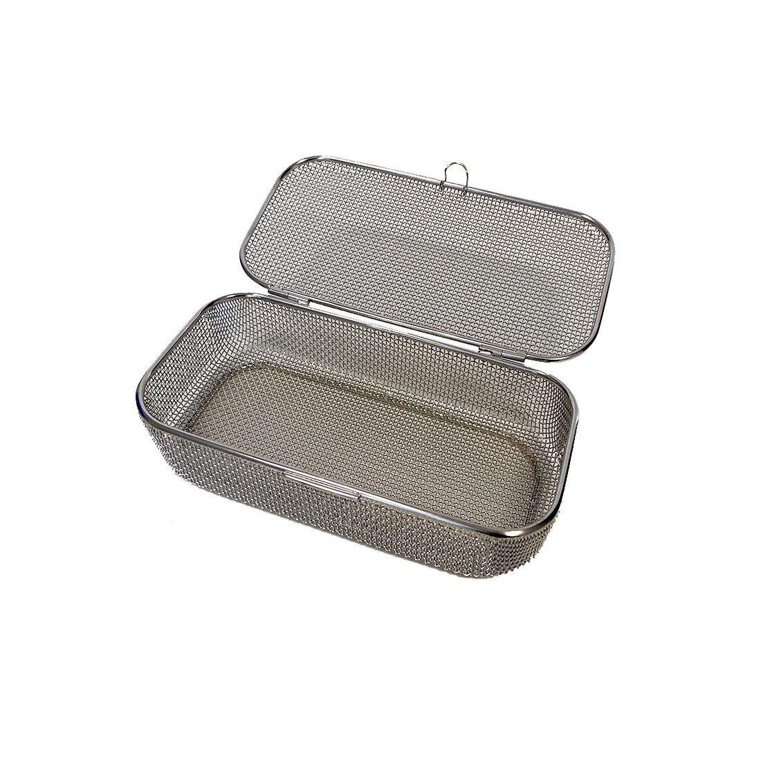 Contenitore realizzato in filo di acciaio inox con trama standard, con bordo ribattuto, ideale per il lavaggio, l'organizzazione e la sterilizzazione di strumentario chirurgico di piccole e medie dimensioni come frese, valvole, connettori, etc.