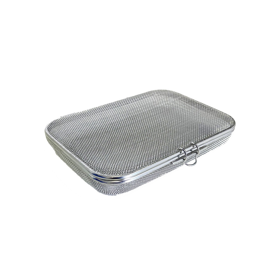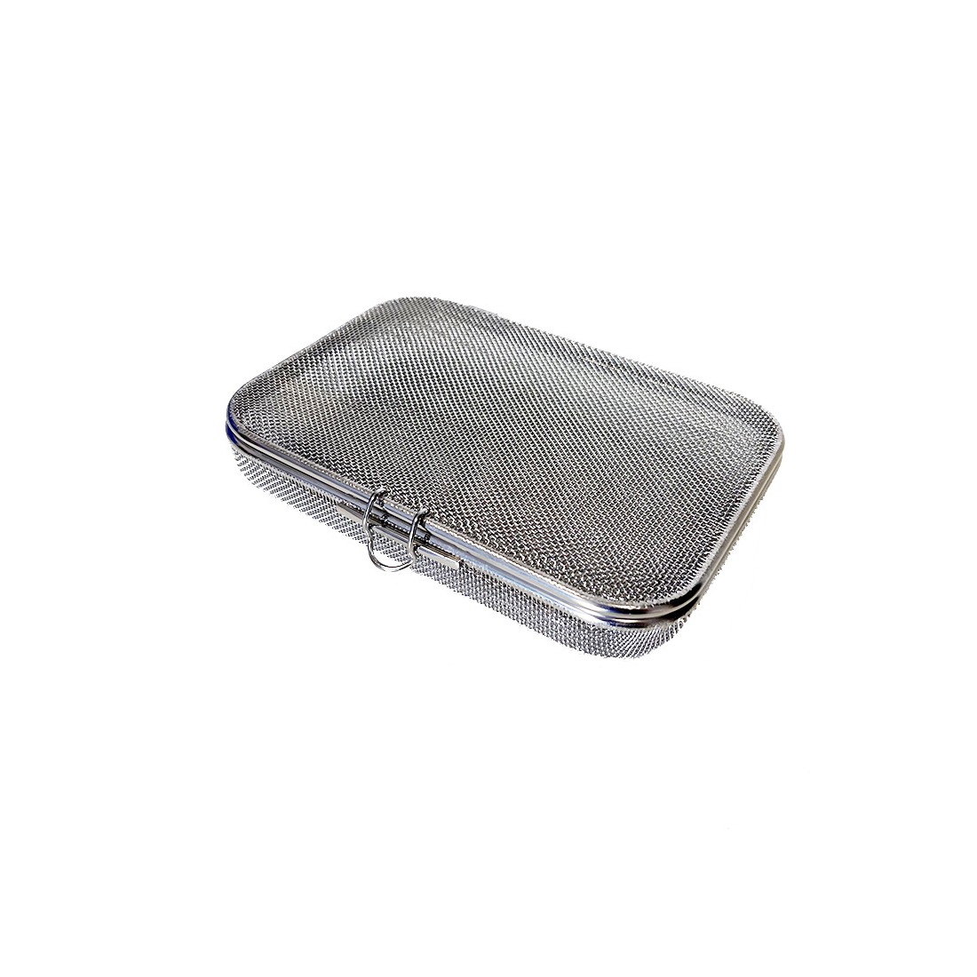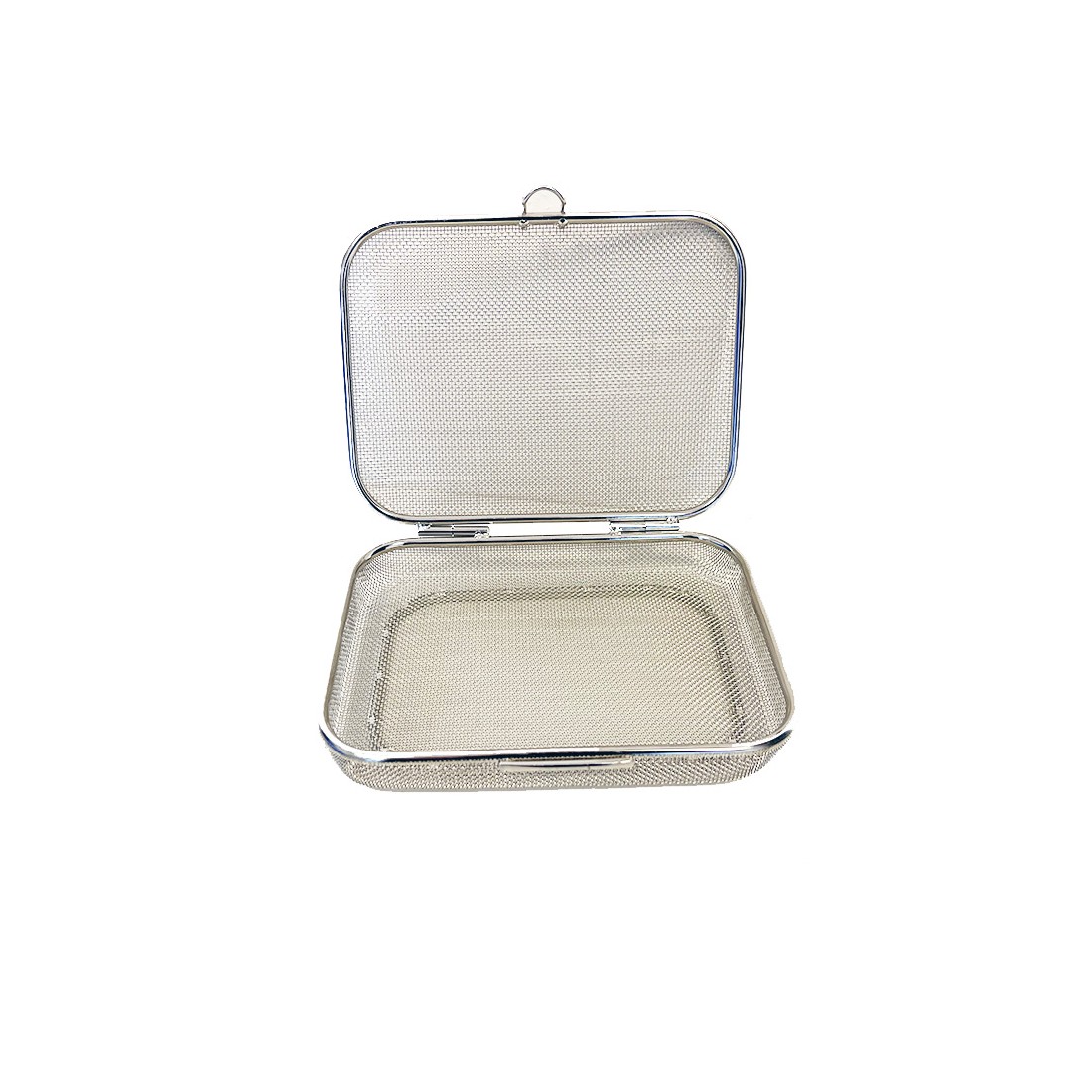 Contenitore realizzato in filo di acciaio inox super fine, con bordo ribattuto, ideale per il lavaggio, l'organizzazione e la sterilizzazione di strumentario chirurgico di piccole e medie dimensioni come frese, valvole, connettori, etc.