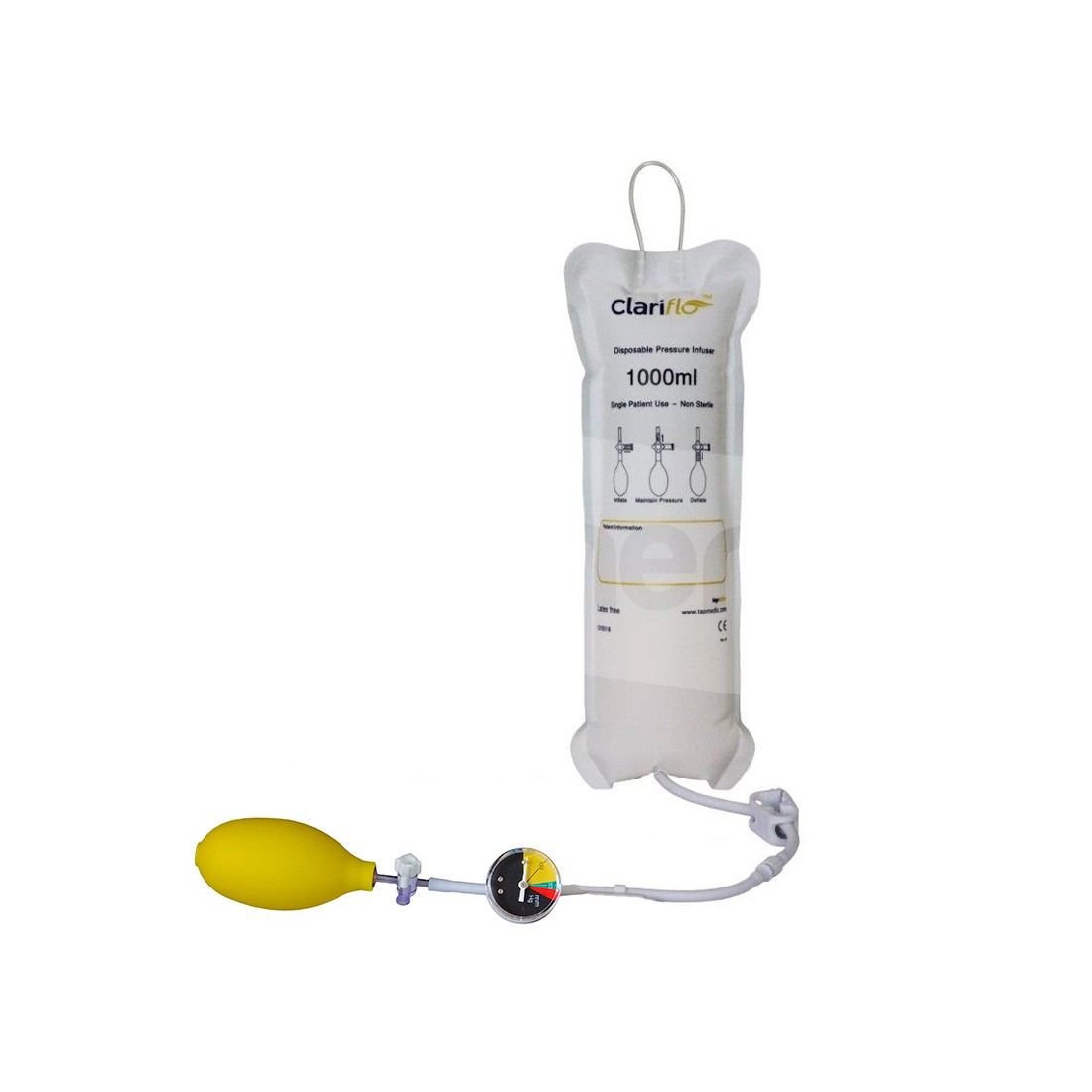 Premisacca per infusione mono paziente da 1.000ml, dotato di manometro, pompetta manuale e rubinetto.