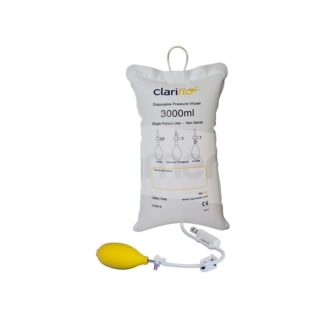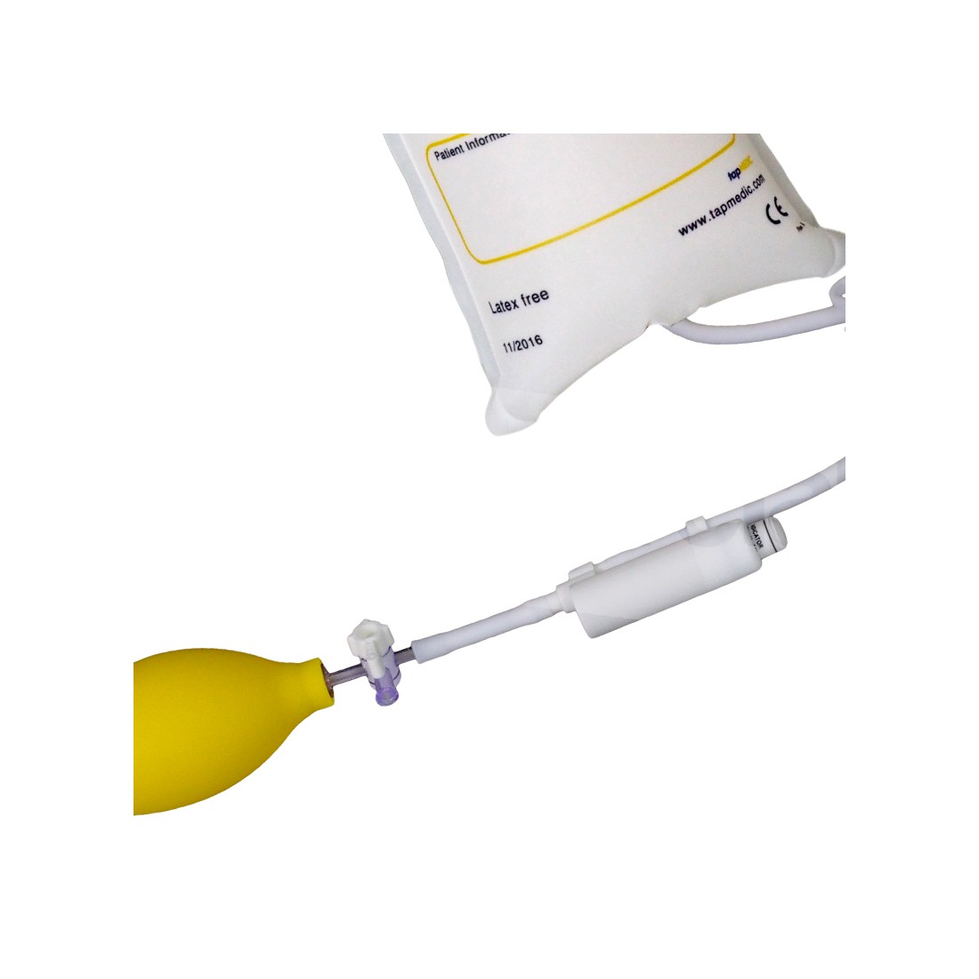 Realizzato in nylon di alta qualitò, di colore bianco, provvisto di retro in materiale trasparente per una immediata visualizzazione della sacca, il premisacca è dotato di pompetta manuale ed indicatore di pressione a pistone, con rubinetto. Il dispositivo è inoltre provvisto di asola nella parte superiore per un corretto posizionamento in piantana.