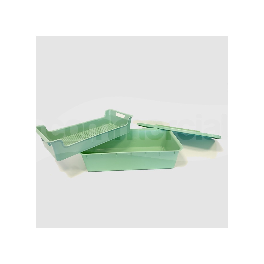 Realizzato in plastica estremamente resistente agli urti ed alle sollecitazioni questo set è composto da base graduata all'interno, griglia interna e coperchio di chiusura. La griglia interna è dotata di n. 2 pratiche maniglie per una presa sicura anche in presenza di bagnato.