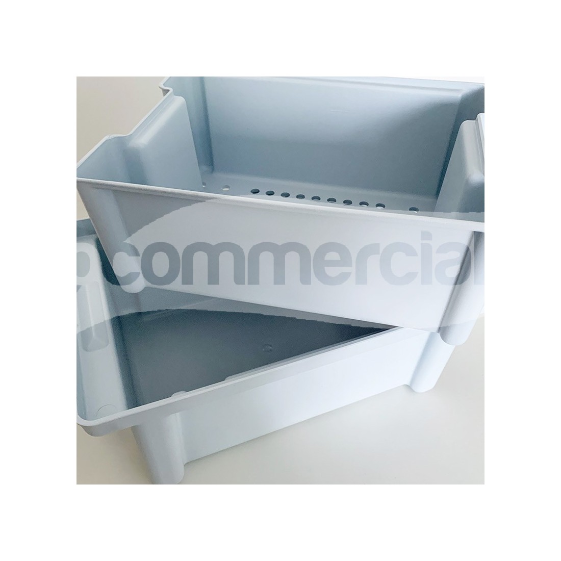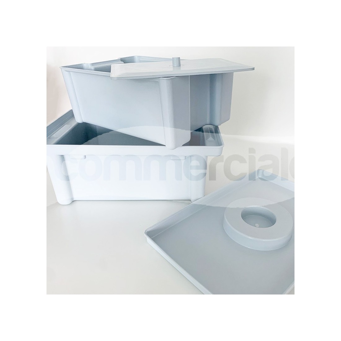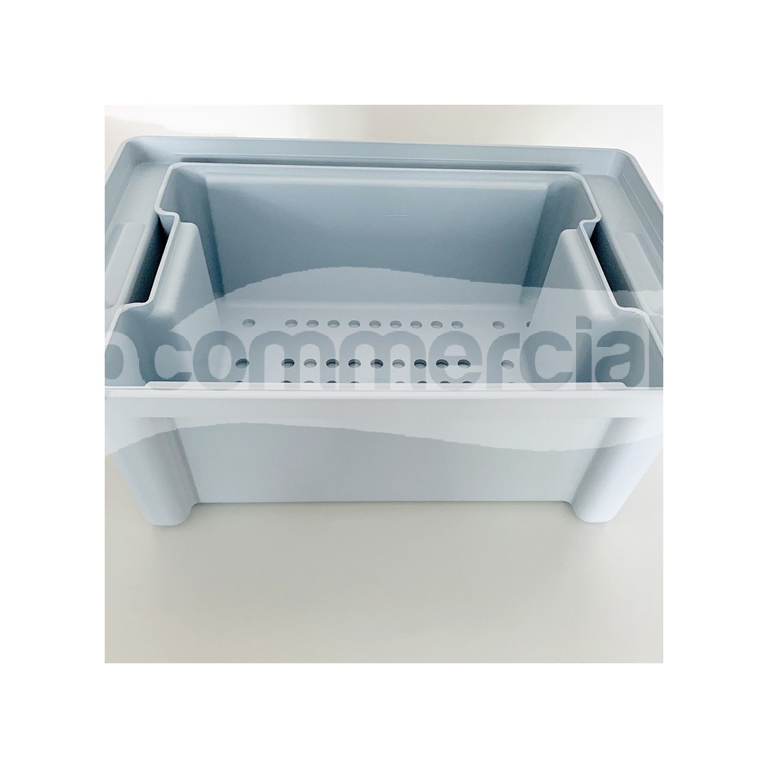 Set per la raccolta, decontaminazione e trasporto dello strumentario chirurgico, realizzato interamente in polimero plastico e completo di griglia interna, base, coperchio e piastra di ammollo per parti galleggianti. La vasca interna è graduata.