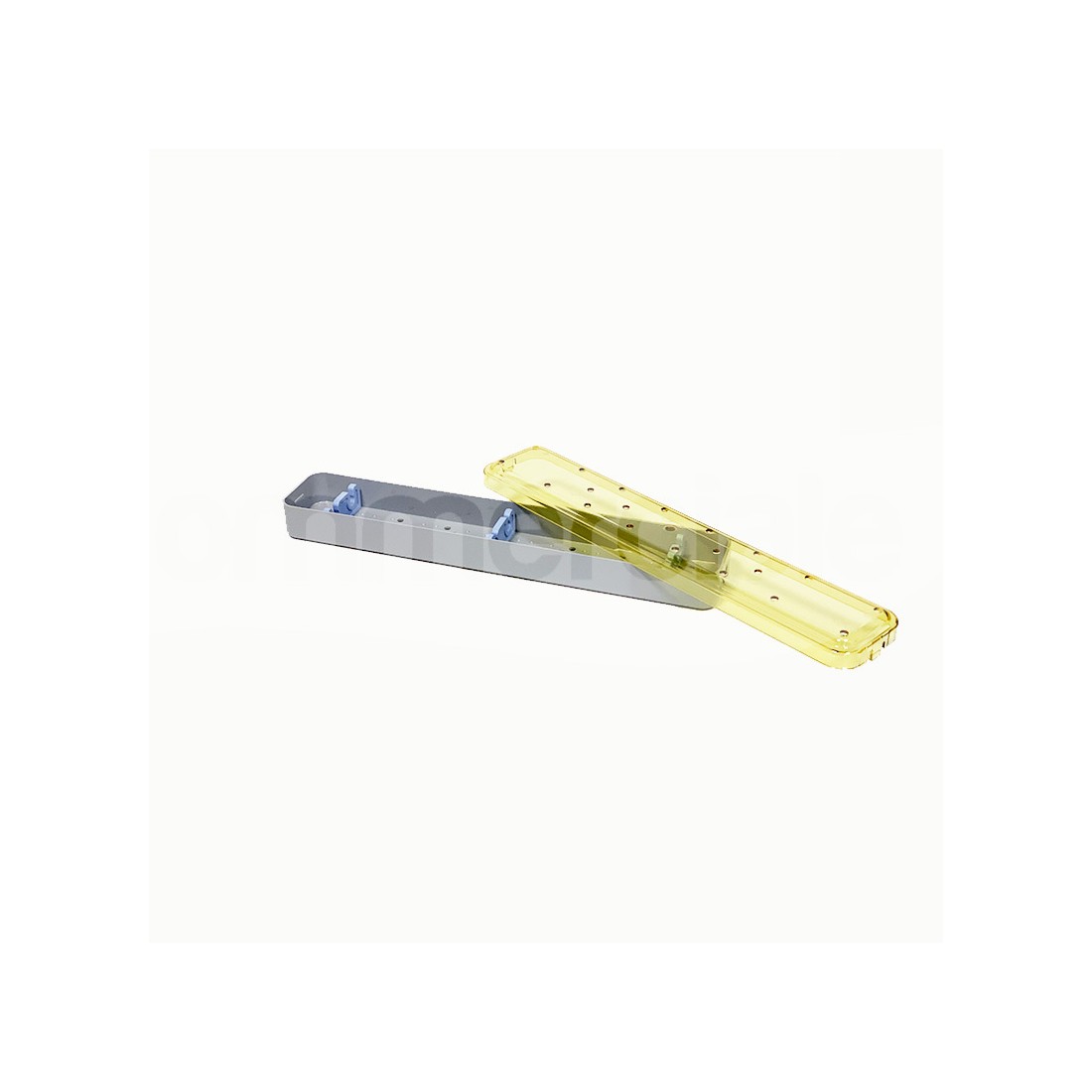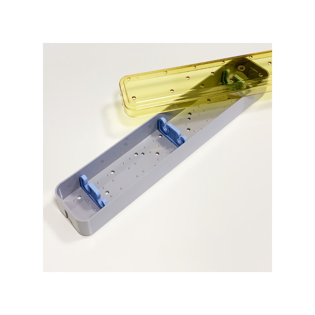 Vassoi pluriuso realizzati in materiale plastico, dotati di base, coperchio e supporti interni in silicone per la corretta organizzazione di ottiche endoscopiche durante il processo di sterilizzazione, stoccaggio e movimentazione.